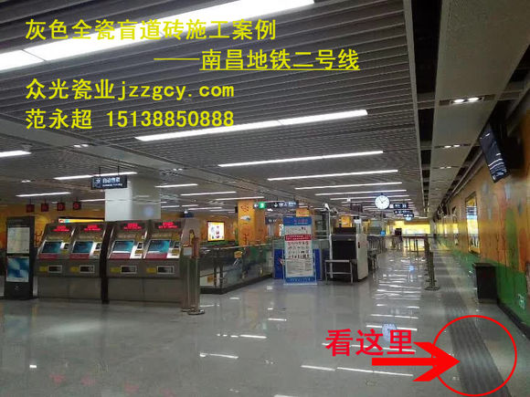 就在今天這個喜慶的日子里,激動人心的時刻到了,南昌地鐵二號線在經(jīng)過建筑工人們近一年的艱苦奮戰(zhàn),已于近日峻工完成,今天就是試運日,開通儀式將在地鐵大廈隆重舉行。該地鐵線路施工所使用的盲道磚均采用的是眾光灰色全瓷盲道磚,施工前期使用的大部分規(guī)格為400*400*20,后期有使用少量300*300*20的規(guī)格。眾光灰色全瓷盲道磚不只應用于南昌地鐵,北京地鐵、鄭州地鐵、武漢地鐵等國內(nèi)許多城市的地鐵都采用的是眾光灰色全瓷盲道磚。眾光灰色全瓷盲道磚外觀大氣高雅,陶瓷材質(zhì)防滑耐磨吸水率低,使用易清洗,是石材、塑膠、水泥、不銹鋼等材質(zhì)不可比的。眾光盲道磚是按國家行業(yè)標準規(guī)定的盲道尺寸規(guī)格生產(chǎn)的,主要用于城市道路及火車站、汽車站、地鐵站臺、人行道上的鋪設,它是殘疾人指引行走無障礙的專用設施。